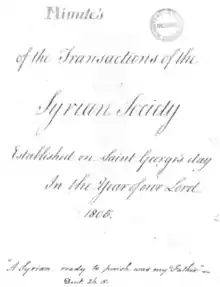 The society was founded on 31 March 1805, with its first meeting of 13 members taking place on 24 April 1805, at which it was decided with no further explanation that the Syrian Society "shall henceforth be denominated The Palestine Association"[5]