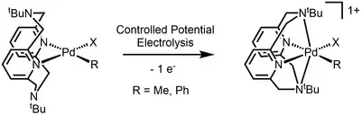 The first organometallic Pd(III) complex characterized by X-Ray crystallography was reported in 2010.[4] Organopalladium complexes supported with a macrocyclic tetradentate ligand undergo single-electron oxidation to give Pd(III) species that is stabilized by the axially-positioned amine. The authors propose that while the axial nitrogen stabilize a distorted octahedral geometry, the t-Bu group and the rigidity of the macrocyclic structure inhibits the oxidation to a more conventional octahedral Pd(IV).