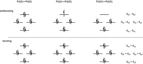 Pairs of Pd(III) centers can couple, giving rise to a Pd–Pd bond. In contrast to the mononuclear Pd(III) complexes, the Pd(III)-Pd(III) dimers are diamagnetic.
