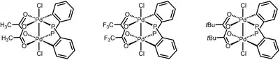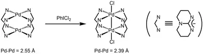 The first example of a dipalladium(III) complex was obtained by oxidation of dinuclear Pd(II) complex of triazabicyclodecene.[5]