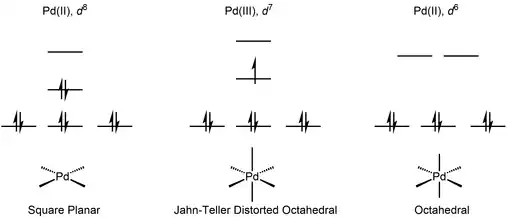 Pd(III) has a d7 electronic configuration, which leads to a Jahn–Teller distorted octahedral geometry. The geometry could also be viewed as being intermediate between square-planar and octahedral. These complexes are low-spin and paramagnetic.