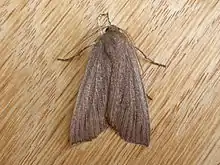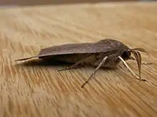 The wingspan is about 60 mm. Adults have streaky brown forewings and pale hindwings.[3]