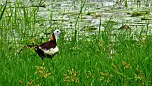 The heterogeneous ecosystem of the marshland supports about 337 species of floras and faunas.[16] Of the faunal groups, birds, fishes and reptiles are the most prominent. Pallikaranai marsh is home to 115 species of birds, 10 species of mammals, 21 species of reptiles, 10 species of amphibians, 46 species of fishes, 9 species of molluscans, 5 species of crustaceans, and 7 species of butterflies. About 114 species of plants are found in the wetland including 29 species of grass. These plant species include some exotic floating vegetation such as water hyacinth and water lettuce, which are less extensive now and highly localised.[2] The region has a bird bio-diversity about 4 times that of Vedanthangal. It is also home to some of the most endangered reptiles such as the Russell's viper and birds such as the glossy ibis, grey-headed lapwings[17] and pheasant-tailed jacana. Cormorants, darters, herons, egrets, open-billed storks, spoonbills, white ibis, little grebe, Indian moorhen, black-winged stilts, purple moorhens, warblers, coots and dabchicks have been spotted in large numbers in the marshland.[18][19] The marsh has also had the distinction of new records of reptiles and plants being described, on a rather regular basis since 2002.[20]