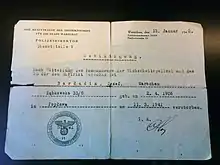 At the glade the prisoners' bags were taken but they were permitted to keep their documents and small belongings. Jews left on the yellow Star of David they were forced to wear as a badge under Nazi occupation; and people who worked in Pawiak's infirmary were found still wearing their badges with the Red Cross symbol. Sometimes prisoners' hands were tied and their eyes blindfolded. The victims were then taken to the edge of the grave and executed by machine gun fire. Sometimes victims were forced to hold a long pole or ladder behind their back. Such supports were later lowered so that the bodies fell into the grave in an even layer. Postwar exhumation proved that the wounded victims were sometimes buried alive.[13][16] SS and OrPo members photographed the executions until it was forbidden by the SS-Standartenführer Meisinger, as happened on 3 May 1940.[17] After the execution was finished, the graves were filled in, covered with moss and needles, and then planted over with young pine trees. Families of the victims were later informed by the Nazi authorities that their relatives had "died from natural causes".[12][18]