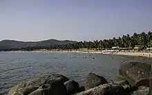 Palolem Beach is largely unspoiled and is inhabited by both local fishermen and by foreign tourists who live in shacks along the shore or in the main village itself.[1] It is about one mile (approximately 1.61 km) long and is crescent-shaped; one can view the entire beach from either end. Both ends of the beach consist of rocks jutting out into the sea. The depth of the sea increases gradually, being shallowest at the northern end of the beach, making it safe for average swimmers, and the currents are not fast.