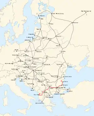 The Corridor VIII is one of the Pan-European corridors. It comprises both road and rail routes. Both commence on the Italian Adriatic coast at Bari or Brindisi, with a ferry crossing to Durrës in Albania. From there the routes cross the southern Balkans into Bulgaria and thence to Varna, on the Bulgarian Black Sea coast. The road corridor follows the route: Tirana/Durrës/Vlorë – Elbasan – Skopje – Pernik – Sofia – Plovdiv – Burgas – Varna.[1] Although as yet incomplete, it is broadly paralleled by the rail route: Durrës/Vlorë-Lin-Radožda-Kičevo-Skopje-Kumanovo-Beljakovtse-Kriva Palanka-Gyueševo-Sofija-Burgas-Varna.