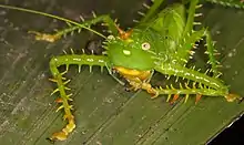 Panacanthus is a genus of conehead katydids found in forests in northwestern South American (western Brazil, Colombia, Ecuador and northern Peru) and Panama, including the western Amazon, the Chocó and the Magdalena River Valley.[2] The common names spiny-headed katydid, spine-headed katydids, spike-headed katydids, thorny devil katydid, thorny devil bush cricket, and similar variations of the sort, do not apply to a single species or to this genus alone, and multiple species are often called by the same common name.