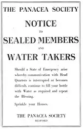 A central purpose of the Society was to persuade 24 Anglican bishops to open Southcott's sealed box of prophecies, and to this end, advertisements were placed in newspapers, both national and local. In the late 1920s and early 1930s the Society generated over 100,000 petitions for the box to be opened.[5] The Society claimed to be in possession of the original box. The Panaceans also believed that the one that was opened in 1927 and found to contain a broken horse pistol and a lottery ticket, was not the genuine box.[6][7]