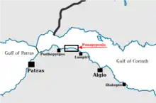 Panagopoula (Greek: Παναγοπούλα)[1] is a coastal region in north Peloponnese between the villages of Psathopyrgos and Lampiri. It is a narrow strip of land between the foothills of mount Panachaiko and the Gulf of Corinth. The land is the last remaining intact part of a large pine tree forest which once was covering all of the mountainous areas above the coast, but it was severely destroyed by multiple forest fires in the previous 20–30 years. Though abandoned by the local authorities it still remains a popular destination for locals and tourists and in the dozen of small pebble beaches, visitors can find some beach bars, restaurants, and camping sites.