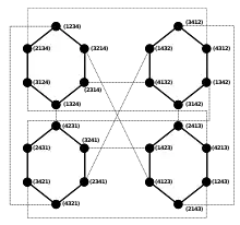 ![]() The pancake graph P4 can be constructed recursively from 4 copies of P3 by assigning a different element from the set {1, 2, 3, 4} as a suffix to each copy. | |