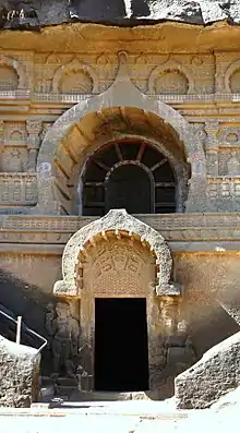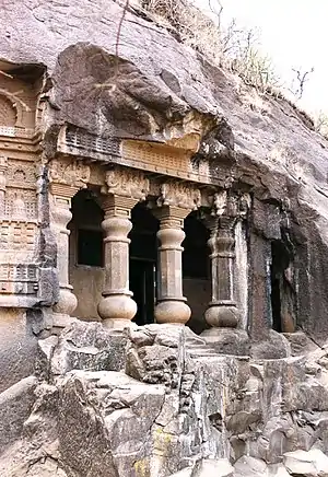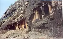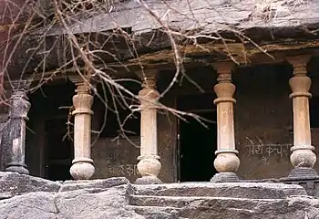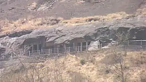 The Nasik Caves,[1] or Trirashmi Leni (Trirashmi being the name of the hills in which the caves are located, Leni being a Marathi word for caves), are a group of 23 caves carved between the 1st century BCE and the 3rd century CE, though additional sculptures were added up to about the 6th century, reflecting changes in Buddhist devotional practices.[2][3] The Buddhist sculptures are a significant group of early examples of Indian rock-cut architecture initially representing the Early Buddhist schools tradition.