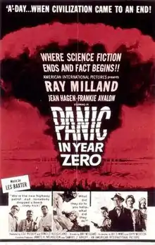 Panic in Year Zero! (a.k.a. End of the World) is a 1962 American black-and-white survival science fiction film from American International Pictures. It was produced by Arnold Houghland and Lou Rusoff, directed by Ray Milland, who also stars with Jean Hagen, Frankie Avalon, Mary Mitchel, and Joan Freeman. The original music score was composed by Les Baxter. The screenplay was written by John Morton and Jay Simms.[2] The film was released by AIP in 1962 as a double feature with Tales of Terror.