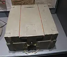 The mine is a square wooden box containing a large block of explosive, the top has a thick rim over which a wooden cover is placed. When pressure on the top of the mine increases, the wooden cover collapses, pressing down on the mine and triggering it.