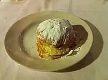 The pantxineta is a typical dessert of the Basque Country. It consists of a bun of puff-pastry filled with thick custard cream; it is topped with almonds and often decorated with icing sugar.