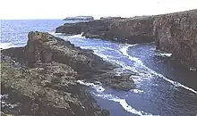 In 1953 the spectacular headland, 'Da Horn o Papa' fell into the sea during a storm. The nearby islet of Brei Holm also has caves that can be accessed by small boats when conditions permit.[8][10][19]