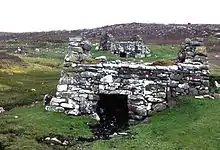 There are good examples of horizontal water mills, also known as Norse or Clack Mills, around Dutch Loch.[28] Originally these were two story buildings with turf roofs, built into banks to give access to the upper floor where the mill-stone was sited. Inside the building there was a fixed lower millstone, and a rotating upper millstone driven by the water falling onto the paddles below. Some were still in use on Papa Stour in the early years of the 20th century, and there is still a working example of one of these mills on the Burn of Clumlie, at Troswick in the south Mainland of Shetland.[22][29]