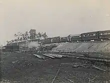 A first bridge for crossing the river was built in 1901 under the administration of the British together with other iron bridges in Kimanis and Membakut.[7] However, it was swept by strong floods into the river where it was replaced with a new iron bridge but also damaged by another floods in 1903.[8] A ferry service was temporarily made while the bridge undergoing repair. In 1904, another strong floods damaging the currently repaired bridge with most of its structure been swept away. A temporary bridge constructed in November 1908 also being swept away by floods.[9] Finally in December 1908, a new bridge was constructed but again damaged by floods in 1913.[10] In 1915, the railway service finally make its way to the Papar town with the opening of a railway bridge.