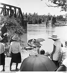 During the World War II, the railway bridge was however destroyed by Allied bombings to prevent it being used by the Japanese with the site also becoming one of the area where the Imperial Japanese Army surrendering to the Australian Imperial Force.[11][12] After the end of the war, the locals need to use small boats to transport people and goods on the other side of the river without the bridge.[5] A new bridge was later constructed although many rumours began to spread around at the time before the bridge construction that to ensure a successful construction of its structure, human heads must be buried at the foundation of the bridge with many locals believed that head hunters would be sent out to look for victims at night that causing everyone to be vigilant.[5]