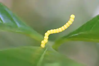 The female lays her eggs one over the other in a stick of ten to sixteen. The orange eggs gradually fade to yellow. The pale black of the larval heads appear on the upperside of the eggs on the fourth day. The eggs hatch on the fifth day.[7]
