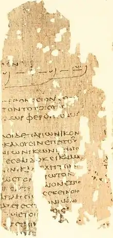 Papyrus Oxyrhynchus 220 (P. Oxy. 220 or P. Oxy. II 220) is a treatise on prosody, written by an unknown author in Greek. It was discovered in Oxyrhynchus. The manuscript was written on papyrus in the form of a roll. It is dated to the first century or second century AD. Currently it is housed in the British Library (Department of Manuscripts, 1184) in London.[1]