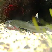 The ayumodoki or kissing loach (Parabotia curtus) is a species of ray-finned fish in the family Botiidae.[3] It is found in lakes and streams on Honshu, the largest island in Japan.[4] Spawning grounds for kissing loach are ditches and small reservoirs for rice cultivation of a river system located in Japan. The kissing loach migrates to flooded areas, including paddy field areas, for spawning in early summer and the spawning of this species is limited after the formation of flooded areas over terrestrial vegetation.[5] These flooded areas are the result of water from mountain streams and irrigation ponds flooding once dry land which create creating man-made wetlands.[6][7] As, adults, Parabotia curtus migrate from these flooded paddy fields to fast moving, muddy streams and rivers like the Yodo River.[3]