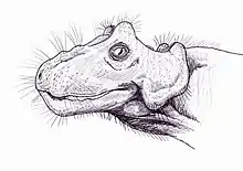 Distinctive characteristics that characterize it as a Burnetiamorph are its: "triangular supraorbital bosses; ridgelike nasal and frontal crests; bosses on the suborbital bar; swollen knob on the squamosal lateral to the quadrate; small incisors; and thickened rim along the posterior margin of the squamosal".[9]