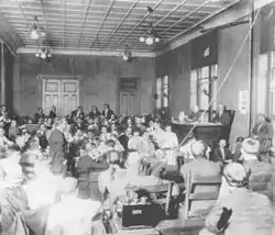 The first day of the trial. Spectators were racially segregated. The stenographer can be seen next to Newt Lee, who is being questioned by prosecutor Hugh Dorsey.