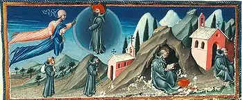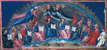 St. Bernard further explains predestination and prays to the Virgin Mary on Dante's behalf. (The Empyrean as a whole abounds in Marian elements, such as the canto number 32's digits' adding up to five, which may represent Mary because of her five-letter name—Maria—and her experiences' having notably come in sets of five.[54]) St. Bernard's prayer, which includes an anaphora using the informal second-person pronoun, draws from a history of similar prayers beginning as early as Greek eulogies. In late medieval Italy, poets such as Jacopone da Todi wrote praises of Mary called laude, and Dante's prayer to the Virgin takes inspiration from this tradition and condenses its form, focusing first on Mary's role on Earth and then her role in Heaven and her motherly qualities.[56]