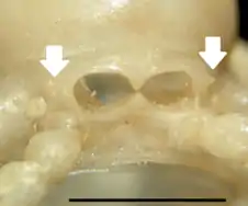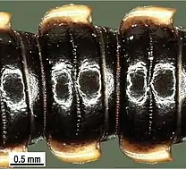 The family is characterised by several traits. Most species possess a groove or furrow ("sulcus") on the dorsal surface between the keels (paranota) on each segment, and the keels of the second body segment are situated lower on the body than those of the first segment (collum) and third segment. In males, the opening on the underside of the body where the gonopods (male reproductive appendages) attach has a central constriction, forming the shape of an hourglass or dumb-bell. Males of most species also possess one or two projections on the sternite of the fifth body segment.[2][4] Adults may have 19 or 20 body segments in addition the head, and ozopores (defensive gland openings) situated on the lateral margins of keels on (in most species) segments 5, 7, 9, 10, 12, 13, and 15 to the last segment.[2]