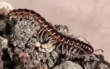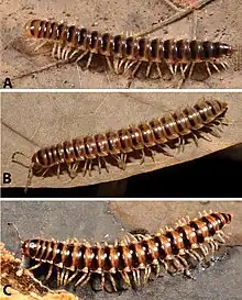 Paradoxosomatidae, the only family in the suborder Paradoxosomatidea (also known as Strongylosomatidea),[1] is a family of flat-backed millipedes in the order Polydesmida. Containing nearly 200 genera and 975 species as of 2013, it is one of the largest families of millipedes.[2] Paradoxosomatids occur on all continents except Antarctica, and can generally be distinguished by dorsal grooves on most body segments and a dumb-bell shaped gonopod aperture. Notable groups within the Paradoxosomatidae include the dragon millipedes of Southeast Asia, and the widely introduced greenhouse millipede Oxidus gracilis.[3]
