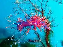 This species can grow to a length of approximately 4 cm and is mostly purple-violet in colour. It has opaque white-tipped certa, rhinophores, and oral tentacles. The rhinophores are annulate.[7] Due to the somewhat transparent skin of the ceras, the branches of the digestive gland are visible, and appear as red-orange.[3][5][6][8][9][10]