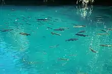 The Paraguay River ecoregion has high species richness with about 350 fish species, including more than 80 endemics.[9] About 80% of the fish species in the river are characiforms (tetras and allies) and siluriforms (catfish).[9] Several of these migrate up the Paraguay River to spawn, including Prochilodus lineatus and Pseudoplatystoma corruscans.[9] Unsurprisingly many species in the river are essentially of Paraná River Basin origin, but the fauna also has a connection with two Amazonian rivers, the Guaporé and Mamoré. While flowing in different directions, the Paraguay, Guaporé and Mamoré all have their source in the same region in central South America. Among the species shared between these are the black phantom tetra, an important fish in the aquarium industry,[10] and the golden dorado, which is important in the fishing industry.[11][12]