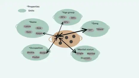 An example of the PDP model is illustrated in Rumelhart's book 'Parallel Distributed Processing' of individuals who live in the same neighborhood and are part of different gangs. Other information is also included, such as their names, age group, marital status, and occupations within their respective gangs. Rumelhart considered each category as a 'unit' and an individual has connections with each unit. For instance, if more information is sought on an individual named Ralph, that name unit is activiated, revealing connections to the other properties of Ralph such as his marital status or age group.[8]