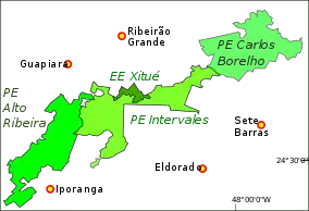 The Paranapiacaba Ecological Corridor, also called the Paranapiacaba Continuum, is part of the Tombamento da Serra do Mar, established by resolution CONDEPHAAT 40/1995, and the Atlantic Forest Biosphere Reserve, created by UNESCO in 1991 and recognized in 1999 as a World Heritage Site.[2] As of 2012 the Atlantic Forest Biosphere Reserve (RBMA) "Sources, Caves and Ecotones" project aimed to create and expand conservation units in the Paranapiacaba Ecological Corridor, a unique area for biodiversity conservation, with the largest remaining fragment of Atlantic Forest. The corridor is composed of the Carlos Botelho, Intervales and Alto Ribeira Tourist state parks, the Xitué Ecological Station and the Serra do Mar and Quilombos do Meio Ribeira environmental protection areas.[2]