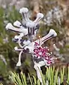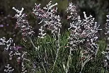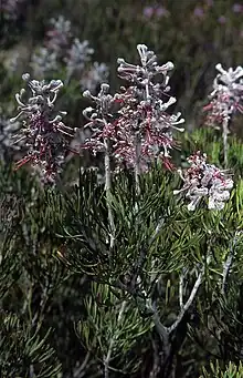 The shrub grows up to 1.5 m (4.9 ft) tall and flowers mainly from August to November. Fire destroys the plant but the seeds survive. The plant is bisexual and pollinated by insects. The fruit ripens, two months after flowering, and the seeds fall to the ground where they are spread by ants.