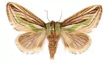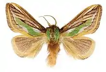 The wingspan is 24–25 mm. The forewing ground colour is chestnut with an ochreous stripe and one median longitudinal green patch delimited by white lines and a subsequent wide brown border. The hindwings are chestnut. The anal margin and marginal scales are ochreous. Adults have been recorded on wing from late May to late June, in mid- and late July and from mid-August to mid-September, possibly in two generations per year.[1]
