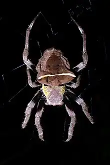 The female Parawixia dehaani is a large, dark brown spider with variable patterns on the abdomen. The most noticeable field characteristic is the triangular abdomen having corners with sharp spikes.[4]