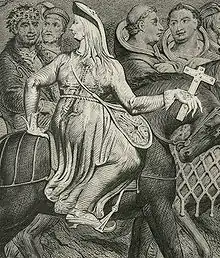 But he will warn that any person that "hath doon synne horrible" will not be able to benefit from these relics.[6] The Pardoner says to the pilgrims that by these tricks he has acquired a considerable sum of money of a hundred marks a year. He goes on to relate how he stands like a cleric at the pulpit, and preaches against avarice but to gain the congregation's money; he does not care for the correction of sin or for their souls.[7] Against anyone that offends either him or other pardoners, he will "stynge hym with my tonge smerte". Although he is guilty of avarice himself, he reiterates that his theme is always Radix malorum ... and that he can nonetheless preach so that others turn away from the vice and repent—though his "principal entente" is for personal gain. The Pardoner explains that he then offers many anecdotes to the "lewed [ignorant, unlearned] people".[8]; from long experience he can tell who are the worst sinners (because of their guilty expressions) and thus who are most eager buyers of his fake relics. He scorns the thought of living in poverty while he preaches; he desires "moneie, wolle [wool], chese, and whete"[9] and does not care whether it were from the poorest widow in the village, even should her children starve for famine. Yet, he concludes to the pilgrims, though he may be a "ful vicious man", he can tell a moral tale and proceeds.