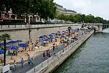 Initially there was a single beach on the Rive Droite. In 2006 a second beach was added on the Rive Gauche, and the scheme's name changed from singular to plural.[1] Unlike many beaches in France, topless sunbathing is not permitted. Swimming in the Seine is also not permitted, for safety reasons.[2]