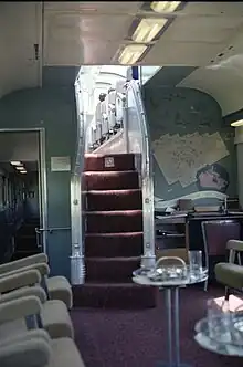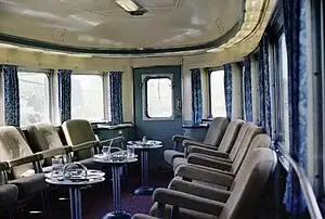 An initial proposal for each car to have its own decorative scheme was rejected on cost ground; instead there were two schemes: "O" and "P"; both of which were developed by Harbeson, Hough, Livingston and Larson, a firm of architects in Philadelphia frequently used by Budd.[4] Additionally, a leading Canadian artist was commissioned to produce two murals for the beverage room: a main mural 81+3⁄8 by 41 in (2,070 by 1,040 mm) for the front wall, and an auxiliary mural 163 by 45 in (4,100 by 1,100 mm) for the right hand (window-side) wall.[5] In addition, they were asked to provide a 3 by 5 ft (0.91 by 1.52 m) decorative map for the observation lounge which was mounted above the writing desk to the right of the dome staircase. Both related to the Park the car was named after. At the time of their construction in 1954 the listed capacity throughout the car was 54 persons.[1] Via removed the murals in 1986.[6] Via rebuilt the cars in the early 1990s, converting them to Head End Power (HEP), and renumbering them into the 8700-series. They also added a panel of clocks to the observation lounge showing the different time zones in Canada.[7]