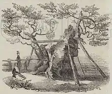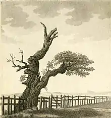 The tree was drawn in 1790, at which point it measured 28 feet 6 inches (8.69 m) in circumference at a height of 1 yard (0.91 m).[2] By 1843 it stood on the Ollerton high road, at a point 4 miles (6.4 km) from Ollerton and on the fringe of what remained of Sherwood Forest. It measured 25 feet (7.6 m) in circumference at a height of 4 feet (1.2 m) from the ground and had a large hollow within it that could accommodate six men.[3] The Parliament Oak was owned at this time by William Bentinck, 4th Duke of Portland who feared it was in danger of dying. He ordered a support framework erected to reinforce the tree against gales. He also planted an acorn within the hollow trunk to grow a replacement.[3]