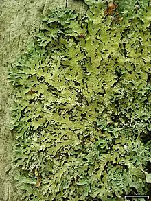 Parmelia squarrosa, commonly known as the bottlebrush shield lichen, is a species of foliose lichen in the family Parmeliaceae. It occurs in east Asia, Europe, and eastern North America, where it typically grows on tree bark, much less frequently on rocks, and rarely on moss. Because of its abundance, widespread distribution, and stable populations, it has been assessed as a species of least concern by the International Union for Conservation of Nature. Parmelia saxatilis is quite similar in appearance Parmelia squarrosa and the latter was quite often confused with the former, especially in herbarium collections. Molecular phylogenetic analysis proved the genetic distinctness between the two species, which are morphologically distinguished by difference in rhizine structure.