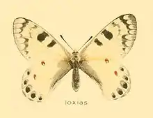 Parnassius loxias is a high-altitude butterfly which is found in Kirghizia and west China. It is a member of the snow Apollo genus (Parnassius) of the swallowtail family (Papilionidae).