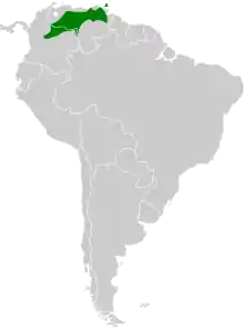 It is found in Trinidad, far north-eastern Colombia and northern Venezuela. It was previously considered conspecific with the red-capped cardinal (Paroaria gularis), from which it differs by the black ear-coverts and the red (not black) lower throat and upper chest. Additionally, its lower mandible is typically whitish, but this is not entirely consistent, as it occasionally is pale flesh-coloured. This distinctive taxon as a distinct species, as suggested by the lack of hybridization with P. g. gularis in the limited area of overlap in southern Venezuela.[2][3] The common name masked cardinal was suggested.[4]
