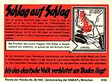 Parole der Woche ("Slogan of the Week"[1] or "Word of the Week"[2]) was a wall newspaper published by the Reichspropagandaleitung der NSDAP (propaganda department of the Nazi Party) from 1937 to 1943.[3] Historian Jeffrey Herf describes Parole der Woche as "the most ubiquitous and intrusive aspect of Nazism's visual offensive ... no form of Nazi visual propaganda made so crucial a contribution to the regime's presentation of ongoing events".[2]
