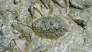 | Dorsal view of Paromoionchis tumidus in the mud (head is on the right). | |