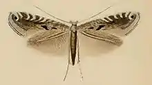 The wingspan is 9–10 mm. The head is fuscous, more or less mixed with white. Palpi white, sometimes with dark fuscous subapical ring. Forewings are grey, irrorated with dark fuscous and white ; numerous costal strigulae, a spot in middle of disc and another posteriorly, and two dorsal spots white ; a blackish apical spot ; cilia with two dark fuscous lines, tips round apex white, beneath apex with a third dark fuscous line. Hindwings are grey. The larva is whitish green ; dorsal line dark green ; head brownish ; segment 2 with four black spots.[3]