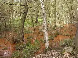 There are old mineworkings in the area, from which iron oxide leaches, giving the stream a reddish colour.[1]