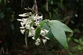 The flowers of P. heterophylla are "white, scented, and tubular with anthers hidden within the tube."[5] This species has also been observed rarely to have yellow flowers.[7] They appear in many-flowered, fairly compact clusters on the plant.[7] The flowers are small, each usually up to 8mm in size.[6] The flowers are often described for their peculiar scent.[1] Often seen draped over the tops of tall trees, the flowers are more recognisable by their scent than their appearance.[5]
