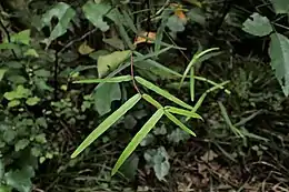 The fruit of P. heterophylla is a long, narrow pod that opens to release tufted seeds.[5] These seeds pods are around 15 cm long.[6] Each pod holds numerous seeds, and each one is tipped with a tuft of silky hairs.[2] The two-valved pod opens from the tip downwards, bending outwards and raising seeds up so that their tufts can be caught by the wind.[8] The fruit pods start green, turning to brown and then after the seeds have been dispersed, the dry, empty pods hang a long time on the plant.[2]